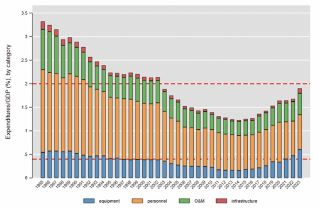 Figure 6: Disaggregated Military Expenditures by Year, Non-U.S. NATO, 1985–2023 (Source: Becker, Benson, Dunne, and Malesky, 2024)