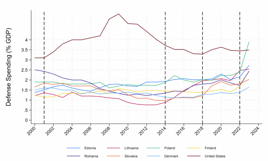 Figure 7 is suggestive on this front. U.S. defense spending shifted dramatically upward from 2001, then many allies shifted upward after 2014, Slovakia after 2018, and nearly all allies save the United States after 2022. Such breaks in spending may be associated with breaks in threat perception (i.e., the United States after 9/11, and European allies after Russian aggression in 2014 and 2022).