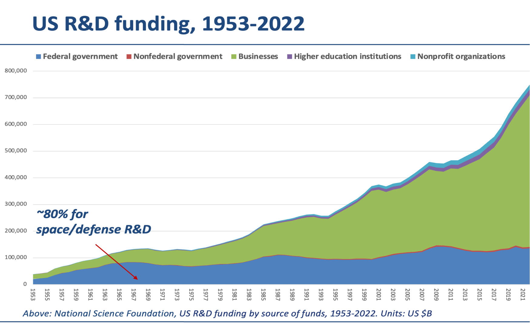 As of 2022, the United States spent an estimated $885.6 billion on research and development, of which $159.8 billion was funded by the federal government. U.S. gross domestic product that year was $26 trillion; total federal outlays were $6.3 trillion. Thus, about 2.5 percent of federal outlays went to research. The chart below (drawn from National Science Foundation data), shows spending on research and development in the United States from 1953 to 2022.