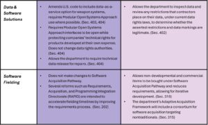 Both bills attempt to make it easier for software and data-centric companies to do business with the government but follow different approaches. In SPEED, the data-as-a-service option allows the government to access and utilize privately held data without acquiring it and encourages quicker fielding of new technologies. FoRGED directly mandates the modernization of several software acquisition pathways, giving greater flexibility and speed in commercial contracting.
