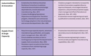 Each piece of legislation promotes more resilient, innovative supply chains, with a strengthened industrial base. SPEED introduces several broad reforms, funding groups that address industrial base issues, whereas FoRGED focuses on expanding the number of secondary suppliers and permits reverse engineering.