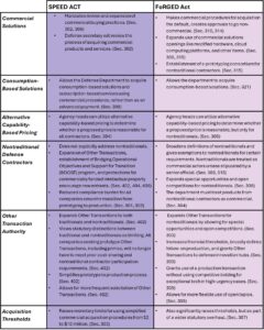 The most noteworthy sections of these bills attempt to address the fundamental issues plaguing acquisition processes. Both bills promote significant commercial solutions reform, including changes to transaction authorities, alternative capability-based pricing, and acquisition thresholds. Whereas the SPEED Act extends these reforms to all companies and is interpreted by some as more prime-friendly, the FoRGED Act places a particular emphasis on streamlining acquisition reform for commercial firms and nontraditional defense contractors.