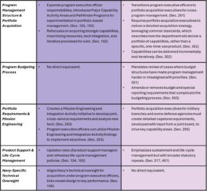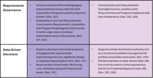 These two bills encourage reforms in similar areas — the acquisitions system, the program-management model, requirements and regulatory burden, innovation and the industrial base, and software and data — but aim to accomplish these reforms in different ways. Read along for a side-by-side comparison of each plan.