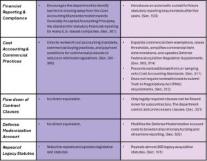 There are thousands of sections of U.S. code and defense legislation that regulate defense acquisitions, and both FoRGED and SPEED take aim at them. SPEED focuses on the burdensome financial and commercial payments process, whereas FoRGED takes a more aggressive approach to requirements, mass-repealing legacy legislation and forming several new financial mechanisms to make it easier to do business with the Defense Department.