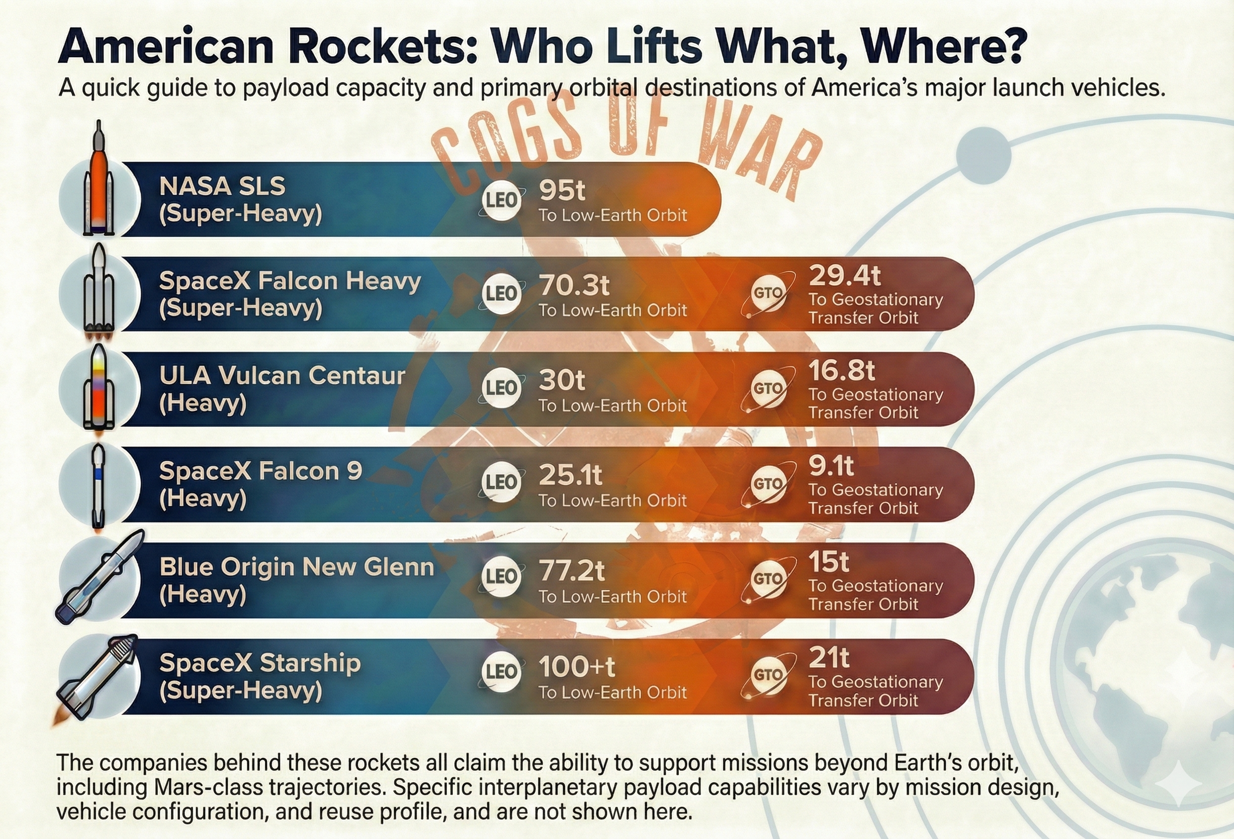 While the payload capacity of these vehicles varies based on factors from reusability concerns to mission design, this graphic presents a simplified comparison of U.S. launch capabilities.