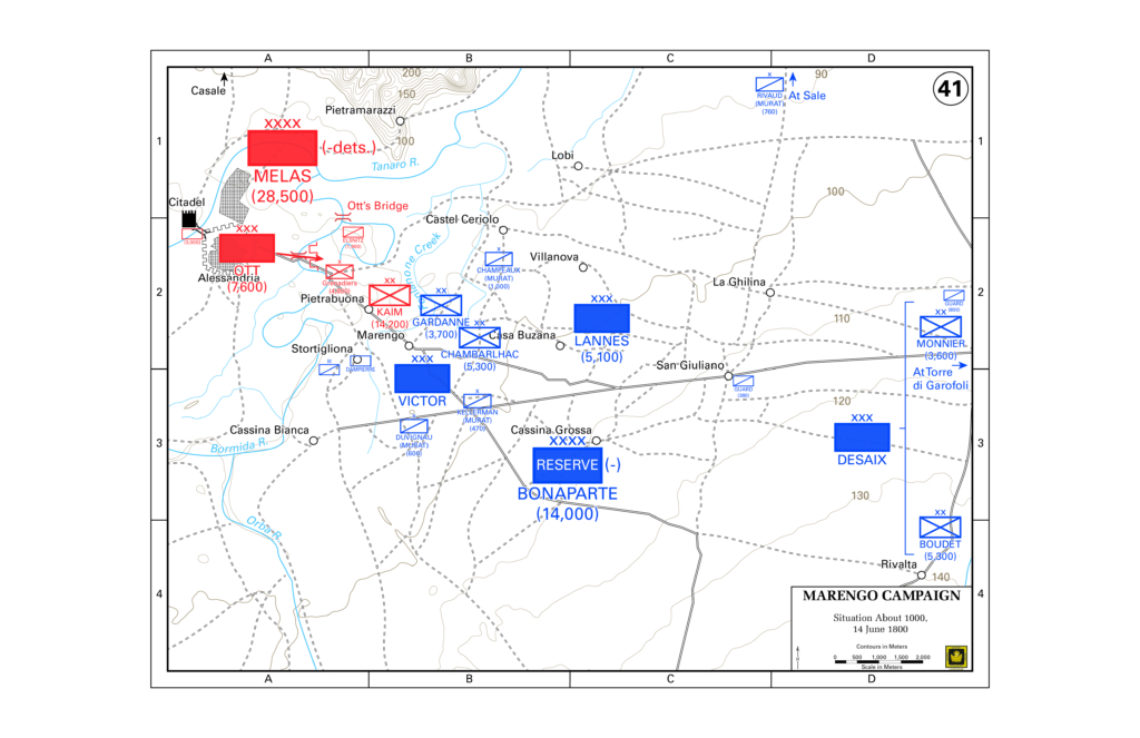 In the early morning hours of June 14, Austrian troops passed through the bridgehead on the Bormida. Victor deployed his divisions in depth, with Gen. Gaspare Gardanne’s troops closest to the bridgehead around the town of Marengo, with Gen. Jean Chambarlhac’s command, and Kellermann’s cavalry brigade a half mile to the southeast at Spinetta. Lannes’ troops were located to the northeast and beyond the Fontanone, too far away to support Victor.