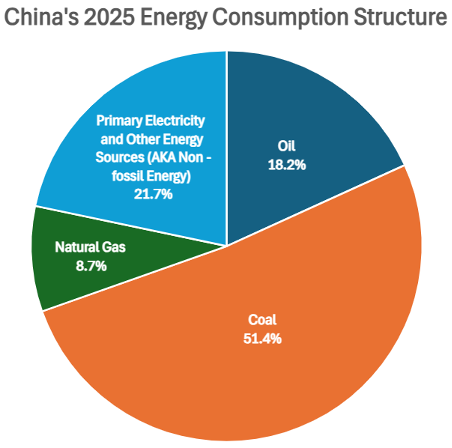 China is, in fact, highly self-sufficient in terms of energy supply. According to People’s Daily, during the 14th Five Year Plan from 2021 to 2025, China’s energy self-sufficiency had consistently been above 80 percent. As a senior executive at China National Petroleum Corporation (China’s largest oil company) asserted in July 2025, the actual level of China’s energy self-sufficiency is as high as 85 percent. Coal remains the primary component of China’s energy sector: around 51.4 percent of China’s total energy consumption. Renewable energy sources surpassed oil in 2024 to become the second largest source of energy in China.