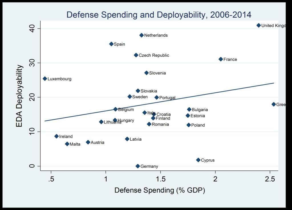 Figure 1: Defense Spending and Deployability. Data Sources: European Defense Agency, NATO, and author calculations.