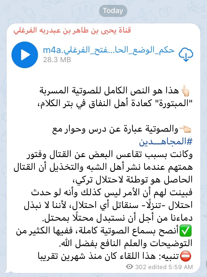 The audio recording is basically a lesson and discussion with the mujahideen, because of the reluctance of some to fight and the flagging of their morale, when the people who typically engage in suspicions and demoralization spread the idea that the battle that was ongoing was paving the way for a Turkish occupation. So I clarified to them that that wasn’t the case, and that if there were an occupation — hypothetically — we would fight any occupation, because we don’t expend our blood in order to replace one occupier with another.