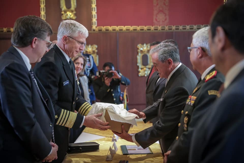 U.S. Navy Adm. Craig Faller meets with Ecuadorian Minister of Defense Gen. Oswaldo Jarrin in 2019. (Photo courtesy U.S. Embassy Ecuador)