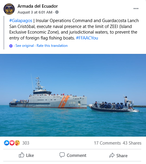 A Facebook post from the Ecuadorian navy on Aug. 3, as the largest Chinese fishing fleet in several years was a few miles outside Ecuadorian waters. (Photo by the author)
