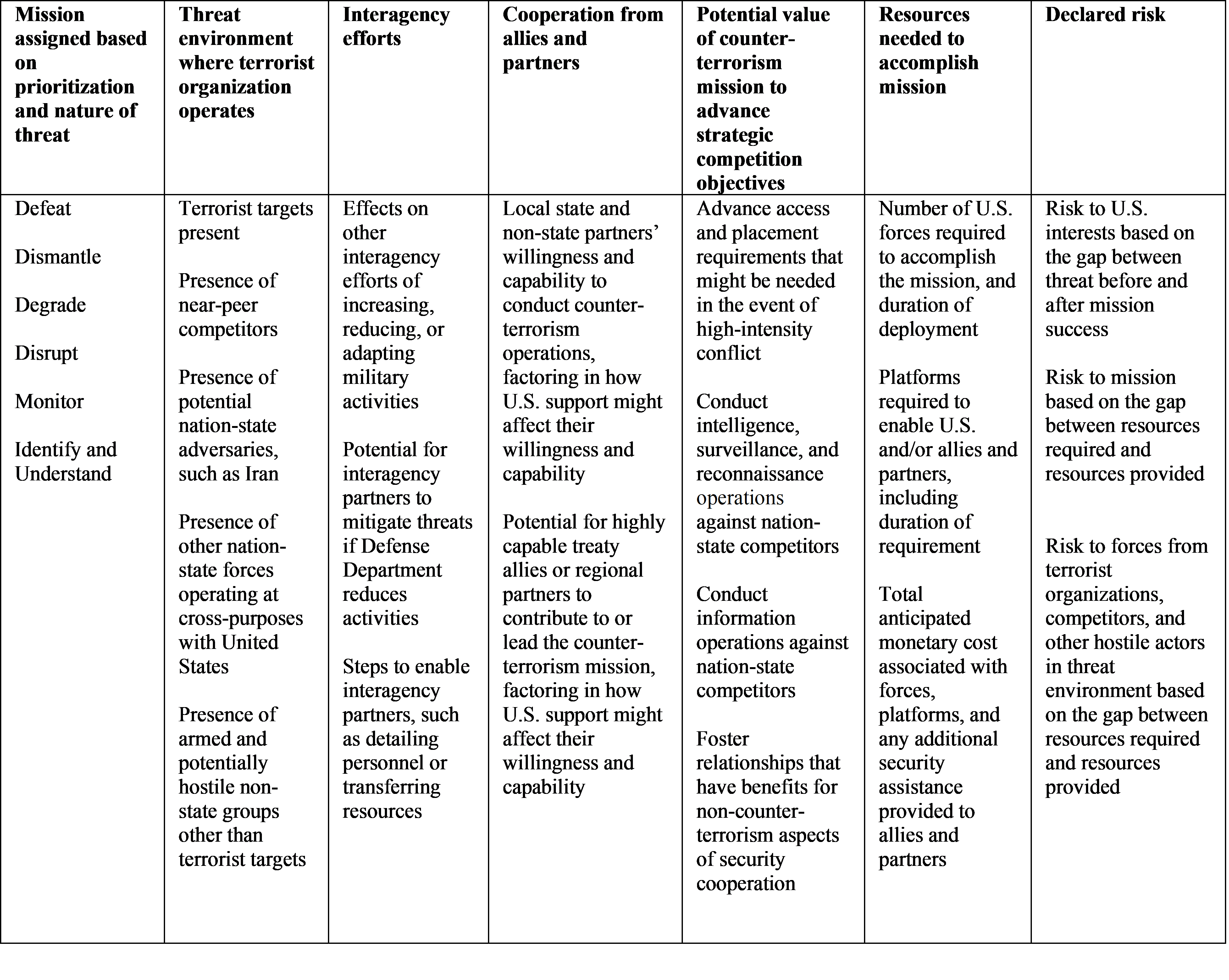 Next, the Defense Department should assign resources to each mission (Column 1 lists the possible missions described above that the Pentagon might assign) based on the factors outlined in the chart. Columns 2–4 include factors for consideration that could enable or encumber pursuit of the mission, as well as possibly increase risk to U.S. forces. When considering the threat environment, the Defense Department should assess not only the risks from the terrorist targets, but also those posed by other actors (e.g., near-peer competitors and nation-state adversaries) that are physically present or able and intent on projecting power into the country or region in question. Regarding the contributions that other U.S. government agencies (e.g., CIA, State Department, U.S. Agency for International Development), allies, and partners could make to a counter-terrorism mission, it will also be important to consider whether and how their efforts might rely on U.S. forces or platforms. Depending on the circumstance, the intelligence community or State Department may develop or expand cooperation with and support for partners’ law enforcement, border authorities, and intelligence communities. Column 5 factors in the potential value of a counter-terrorism mission to advancing strategic competition objectives. There are costs and benefits to including this in the decision calculus. It could enable the Pentagon to maximize the utility of its forces and resources in certain places, but also might be used to justify counter-terrorism activities that the Pentagon otherwise would not conduct or sap resources that could be used to advance strategic competition objectives more effectively elsewhere. Column 6 determines the resources required to accomplish the assigned mission, factoring in the elements identified in Columns 2–5. Column 7 identifies potential known risks to U.S. interests, the mission, and U.S. forces if the resources required are provided.
