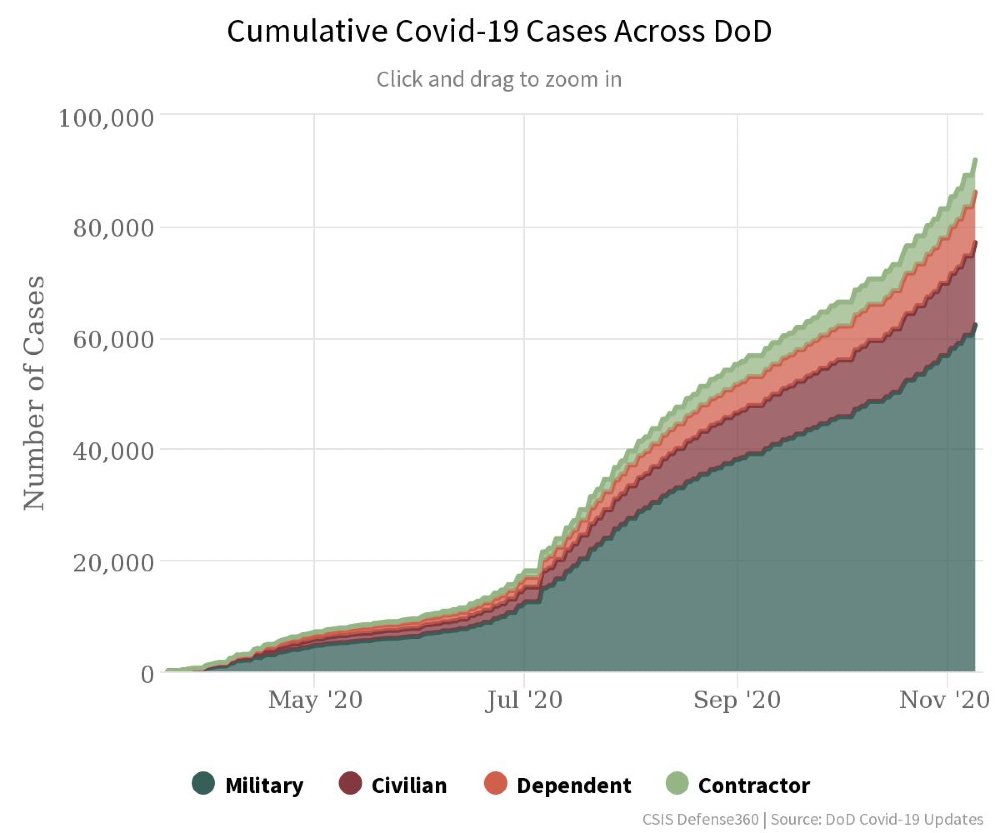 As of Nov. 6, the Defense Department had a cumulative total of 89,000 cases. Most cases (roughly 60,000) have been military servicemembers (active-duty and reserve), averaging 67 percent of all Department of Defense cases over the course of the pandemic. Defense Department civilians constitute the next major group of positive cases, at 14,000 cases, and have averaged 16 percent of total cases. The two smallest groups, dependents and contractors, average 10 and 7 percent of total cases in the military, with about 9,000 and 6,000 cases respectively.